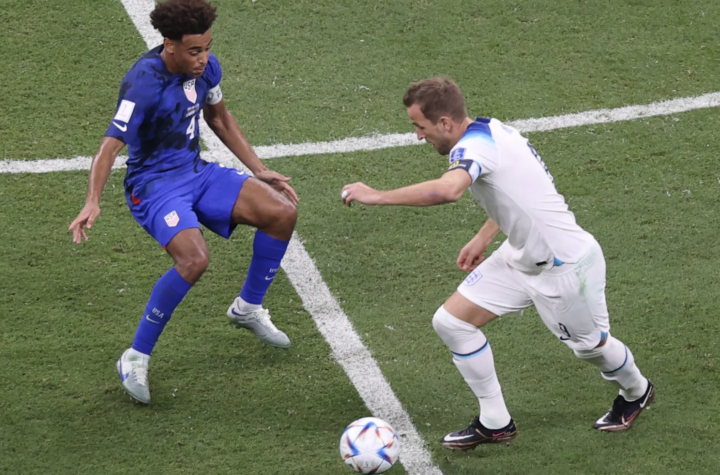 Harry Kane de Inglaterra pelea un balón con Tyler Adams de EEUU. (Foto/ EFE) Al Khor/Agencia Efe La selección estadounidense...