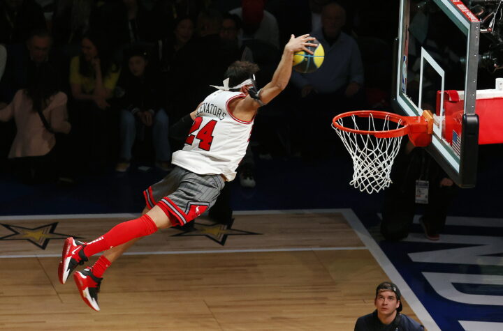 EN INDIANAPOLIS| Un integrante del equipo acrobático de los Chicago Elevators hace un mate durante el descanso del partido All-Star...