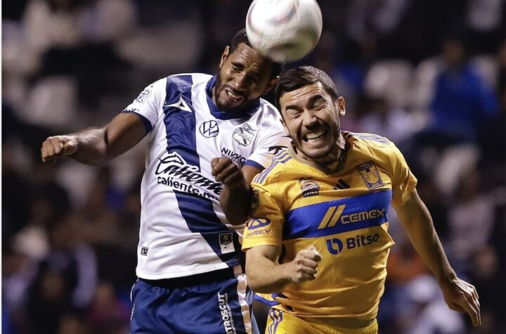 EN EL VOLCÁN| Bryan Angulo del Puebla disputa el balón con Juan Pablo Vigón de Tigres. (Foto/EFE) Monterrey/ Agencia Efe...