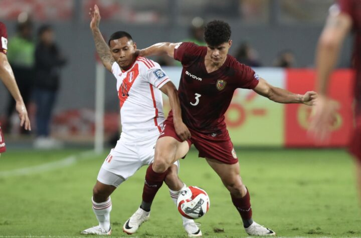 EN LIMA| Bryan Reina de Perú disputa el balón con Yordan Osorio de Venezuela en un partido de las eliminatorias...