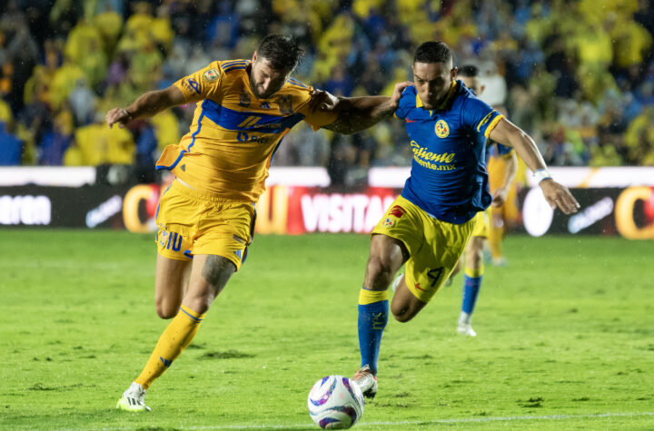 ÚLTIMO JUEGO DE TEMPORADA REGULAR| André Gignac de Tigres disputa el balón con Sebastián Cáceres del América. (Foto/EFE) EL AZUL...