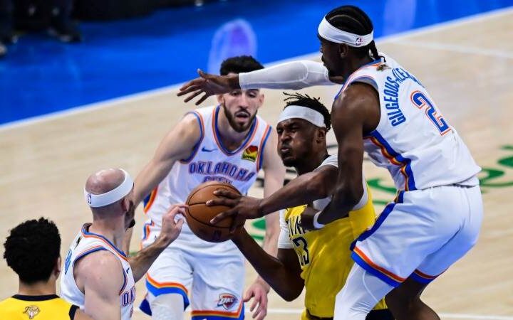 SÉPTIMO JUEGO| Shai Gilgeous-Alexander de Oklahoma City Thunder pelea el balón a T.J. McConnell de Indiana Pacers. (Foto/EFE) OKLAHOMA CONQUISTA...
