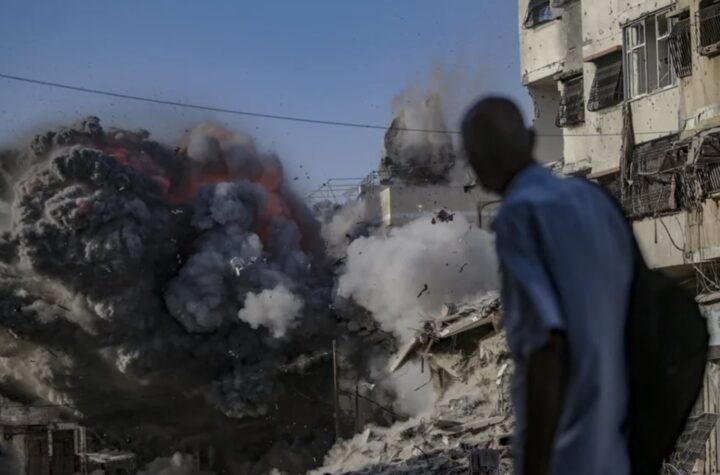 OPERACIÓN MILITAR ISRAELÍ| Humo se eleva sobre el edificio Al Harazin tras un ataque aéreo en la Ciudad de Gaza....