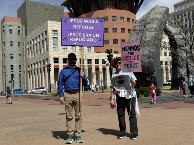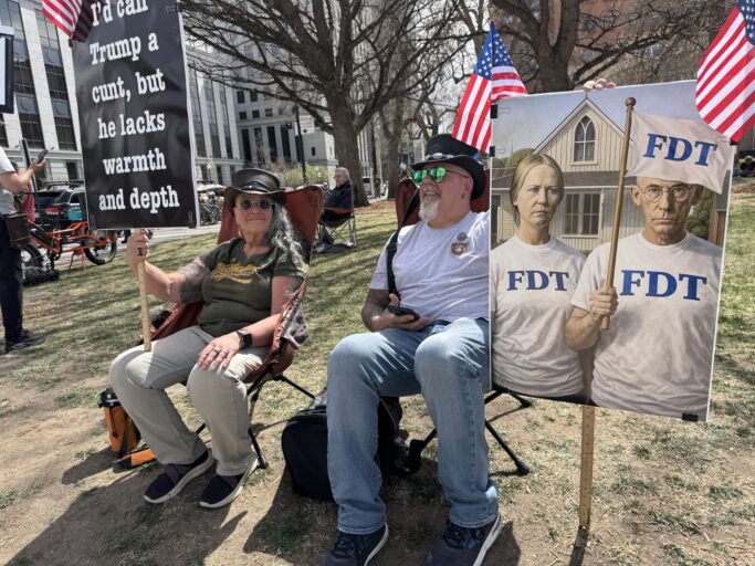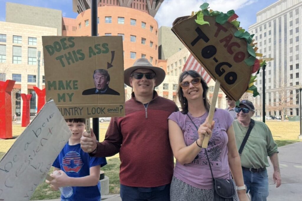 Una pareja decidió vestirse como los icónicos personajes del cuadro “American Gothic”, recreando la famosa pintura en medio de la protesta como una forma de cuestionar la identidad estadounidense contemporánea. A pocos metros, una familia atrajo sonrisas y fotos al portar una pancarta en forma de taco mexicano, recordando la diversidad cultural que forma parte del tejido social del país y del propio Colorado.
