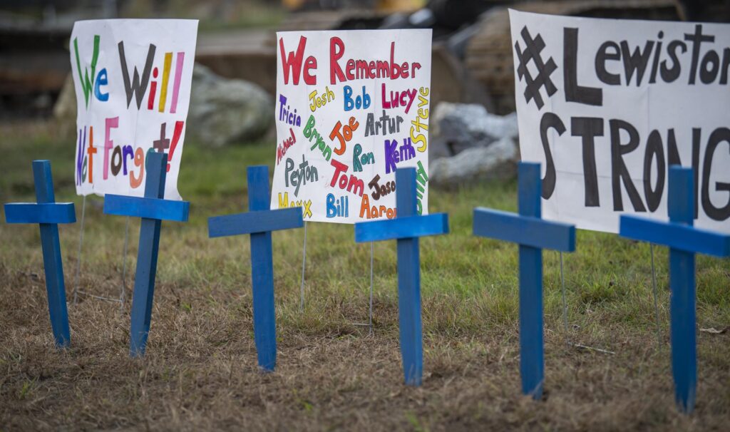 TRAGEDIA EN MAINE| Cruces y letreros con los nombres de las víctimas de un tiroteo masivo en Lewiston. (Foto/EFE)
