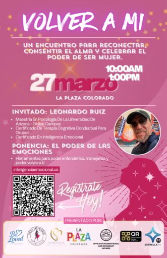 El encuentro “Volver a Mí. Encuentro de Empoderamiento Femenino” se realizará el viernes 27 de marzo de 2026, de 10:00 de la mañana a 1:00 de la tarde, en La Plaza Colorado, en Aurora. Está dirigido a mujeres a partir de los 15 años. La participación es abierta mediante registro previo disponible en inteligenciaemocional.us o a través del código QR del material oficial del evento.
