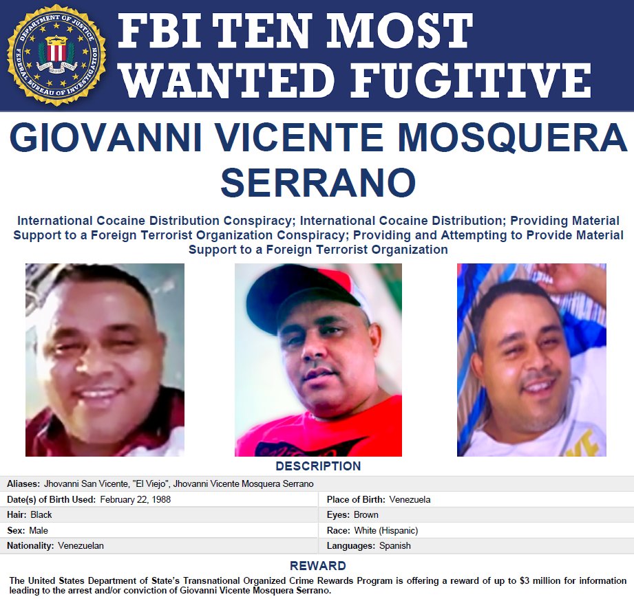 El Tren de Aragua fue designado por EE.UU. como organización terrorista extranjera y organización criminal transnacional significativa. En el comunicado oficial del FBI se afirma que Mosquera Serrano “alimenta una estructura basada en asesinatos brutales, prostitución forzada y destrucción de vidas en varios continentes”. El FBI considera que Mosquera Serrano se encuentra prófugo en algún punto entre Venezuela y Colombia y ha advertido que está armado y extremadamente peligroso.