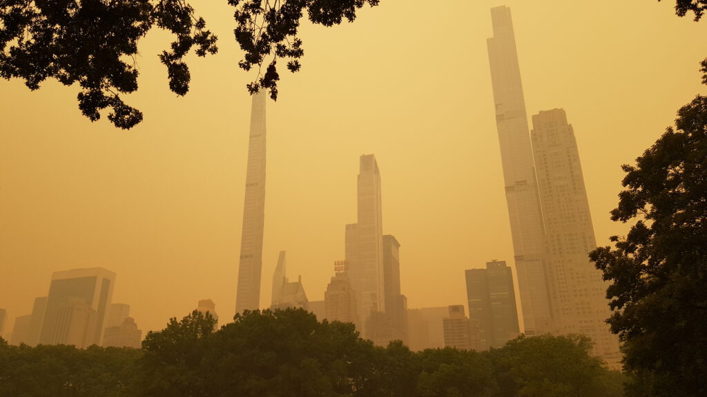 Los edificios de la ciudad vistos desde el Central Park parecían los mástiles de un barco fantasma. La ciudad olía a madera quemada, a incendio. Muchas farolas se encendieron automáticamente ante las oscuridad que invadió el ambiente en el momento más crítico. Las mascarillas para protegerse de las partículas contaminantes volvieron a ocupar las aceras de la Gran Manzana, como no se veía en muchos meses y numerosos centros públicos, como colegios, cancelaron sus actividades exteriores y suspendieron cualquier acto al aire libre.