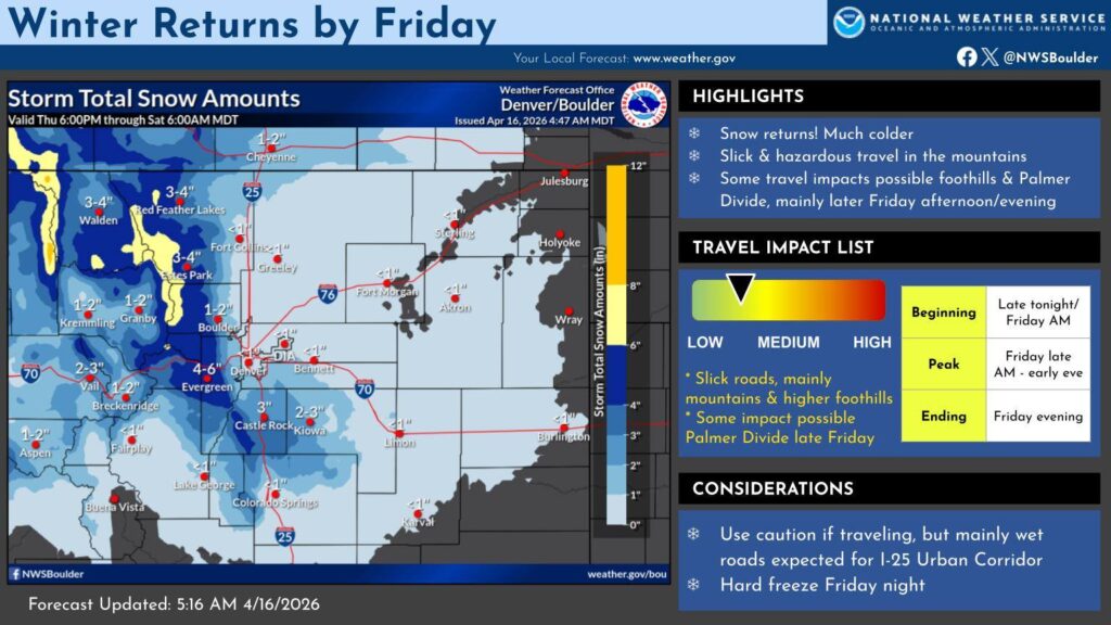 Mientras, en el corredor de la Interestatal 25 se esperan principalmente pavimentos mojados, con posibilidad de condiciones resbaladizas en sectores como Castle Rock y Monument durante la tarde y noche. El riesgo principal se concentrará entre la noche del viernes y la mañana del sábado 18 de abril. Se ha activado una Advertencia de Helada (Freeze Warning) para todo el corredor urbano del Front Range y las llanuras del noreste.
