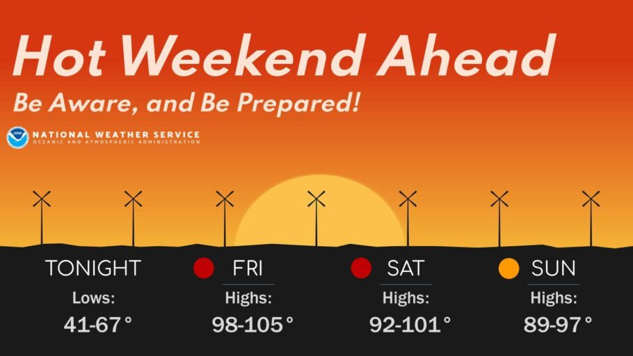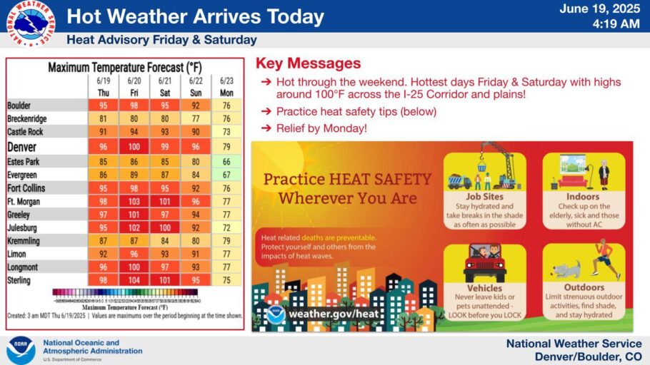 Para Colorado, el NWS Denver/Boulder precisa que las máximas se acercarán o superarán los 100 °F (38 °C) en el corredor de la I-25 y las llanuras. Las cinco ciudades que registrarían los valores más elevados el viernes son Sterling (104 °F/40 °C), Fort Morgan (103 °F/39 °C), Julesburg (102 °F/39 °C), Greeley (101 °F/38 °C) y Denver (100 °F/38 °C). Valores similares se repetirán el sábado antes de un alivio relativo el lunes.