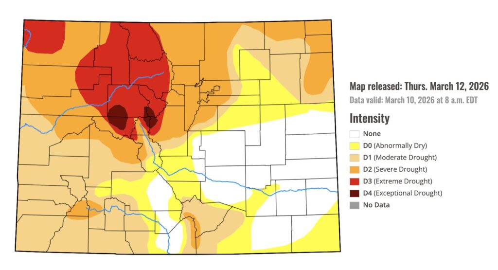 Actualmente, cerca de un tercio del estado enfrenta condiciones de sequía severa o peor. En algunas zonas, especialmente en las cabeceras del río Colorado, persisten niveles de sequía extrema y excepcional. Las altas temperaturas y la falta de nieve afectan directamente el suministro de agua, la agricultura y la disponibilidad de recursos para comunidades rurales.