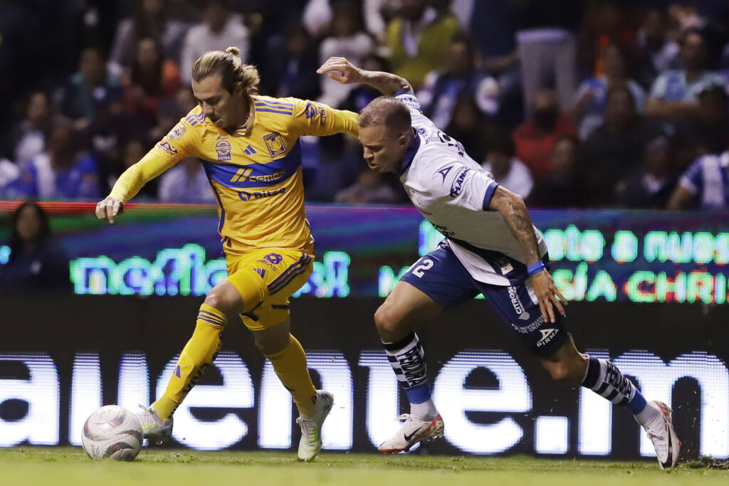 PARTIDO DE IDA| Gustavo Ferraréis del Puebla disputa el balón con Francisco Córdova de Tigres. (Foto/EFE)