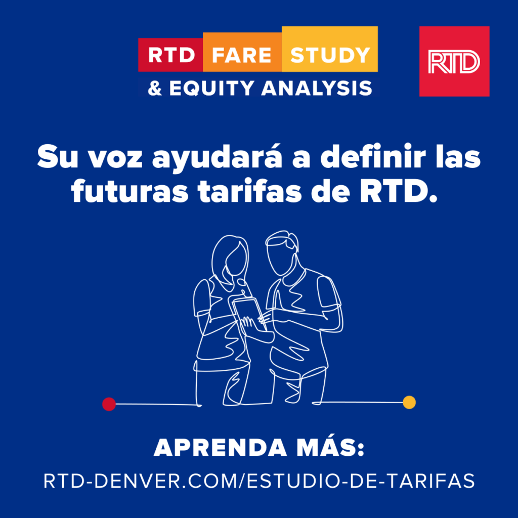 RTD espera que usted opine sobre las alterativas para su estructura tarifaria. Usted puede expresar su opinion sobre las tarifas y presentar otras inquietudes completando una encuesta y participando en su reunion virtual comunitaria del 27 de octubre.