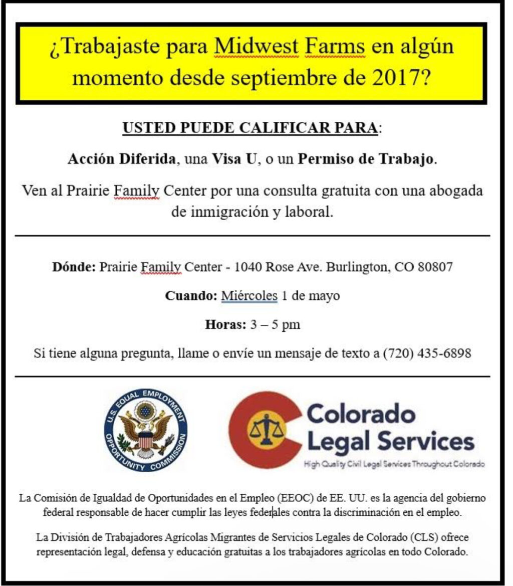 Todos aquellos trabajadores y extrabajadores de Midwest Farms están invitados a una jornada sobre derechos laborales hoy primero de mayo. En el evento que va a tener lugar en Burlington en el noroeste de Colorado aquellos que hayan trabajado para Midwest Farms desde septiembre de 2017 van a conocer sus posibilidad de calificar para la Acción Diferida, Visa U, o Permiso de Trabajo.