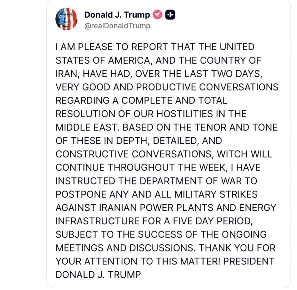 El presidente de Estados Unidos, Donald Trump, aseguró este lunes que “Irán realmente quiere llegar a un acuerdo” y que esto “podría suceder en los próximos cinco días”. El mandatario realizó estas declaraciones a la cadena Fox poco después de anunciar en su plataforma Truth Social que ha ordenado a su Departamento de Guerra posponer durante cinco días los ataques militares contra centrales eléctricas e infraestructura energética iraníes tras “conversaciones productivas” entre EE.UU. e Irán para la resolución de las hostilidades.