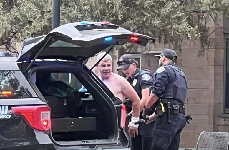 SUPUESTO AGRESOR| Detenido por la Policía de Boulder un hombre sin camisa que fue señalado por testigos de haber lanzado un artefacto explosivo. (Foto/X)